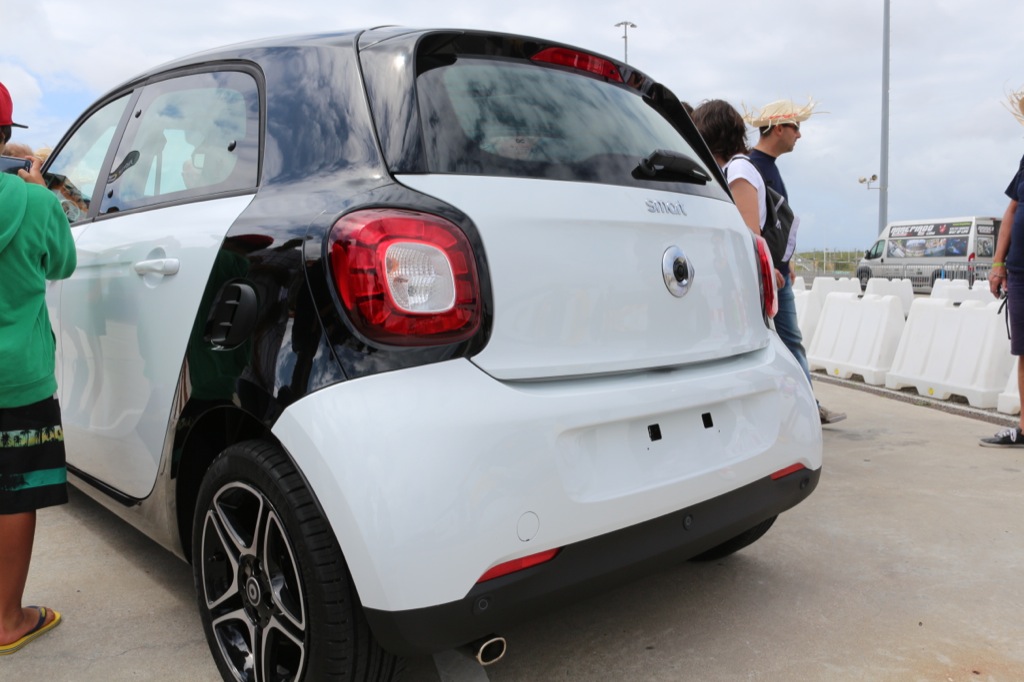 Der smart forfour trägt im Prinzip die gleichen Elemente wie der smart fortwo. Jedoch besitzt er eine einteilige, nach oben öffnende Heckklappe, um den tieferen Gepäckraum bequem beladen zu können.